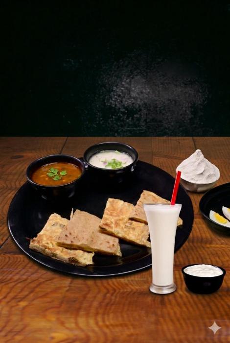 Egg Paratha – A protein-packed delight featuring a soft paratha layered with perfectly seasoned egg, cooked to golden perfection. Lightly crisped and rich in flavor, it’s both nourishing and indulgent.
