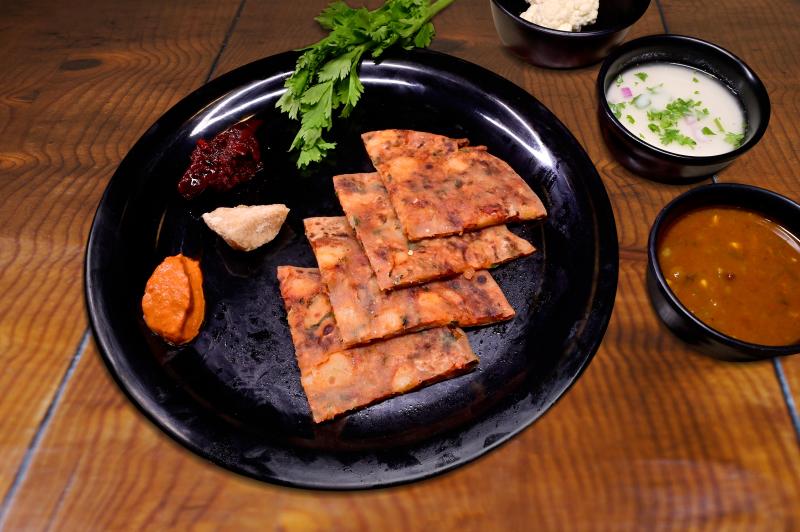 This paneer schezwan paratha with sabji and raita is a delicious choice for breakfast, lunch, or dinner.